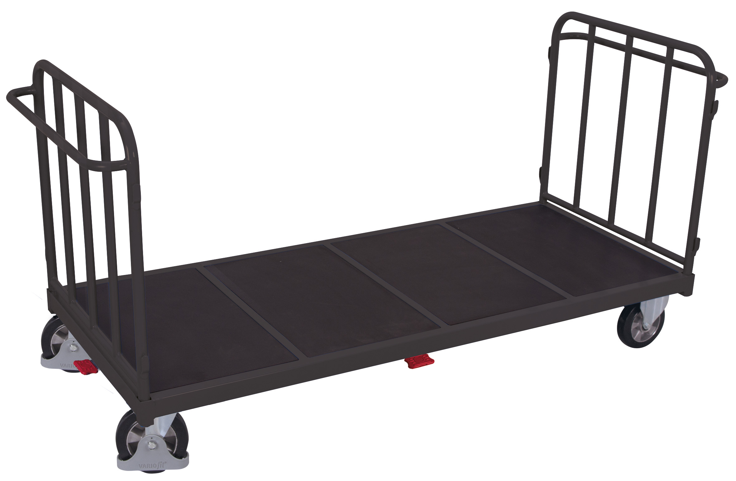 Der Doppel-Stirnwandwagen mit senkrechten Streben bietet eine stabile Stahlschweißkonstruktion im Baukasten-System und einen wasserfest verleimten Sperrholzboden mit rutschhemmender Siebdruck-Oberfläche. Dank hoher Belastung ab 1.200 kg, robusten Stirnwänden mit Schiebegriffen sowie spurlos laufenden Rollen mit Faden- und Fußschutz arbeiten Sie sicher und effizient. Das patentierte EasySTOP-Bremssystem ermöglicht komfortables, präzises Abbremsen.
