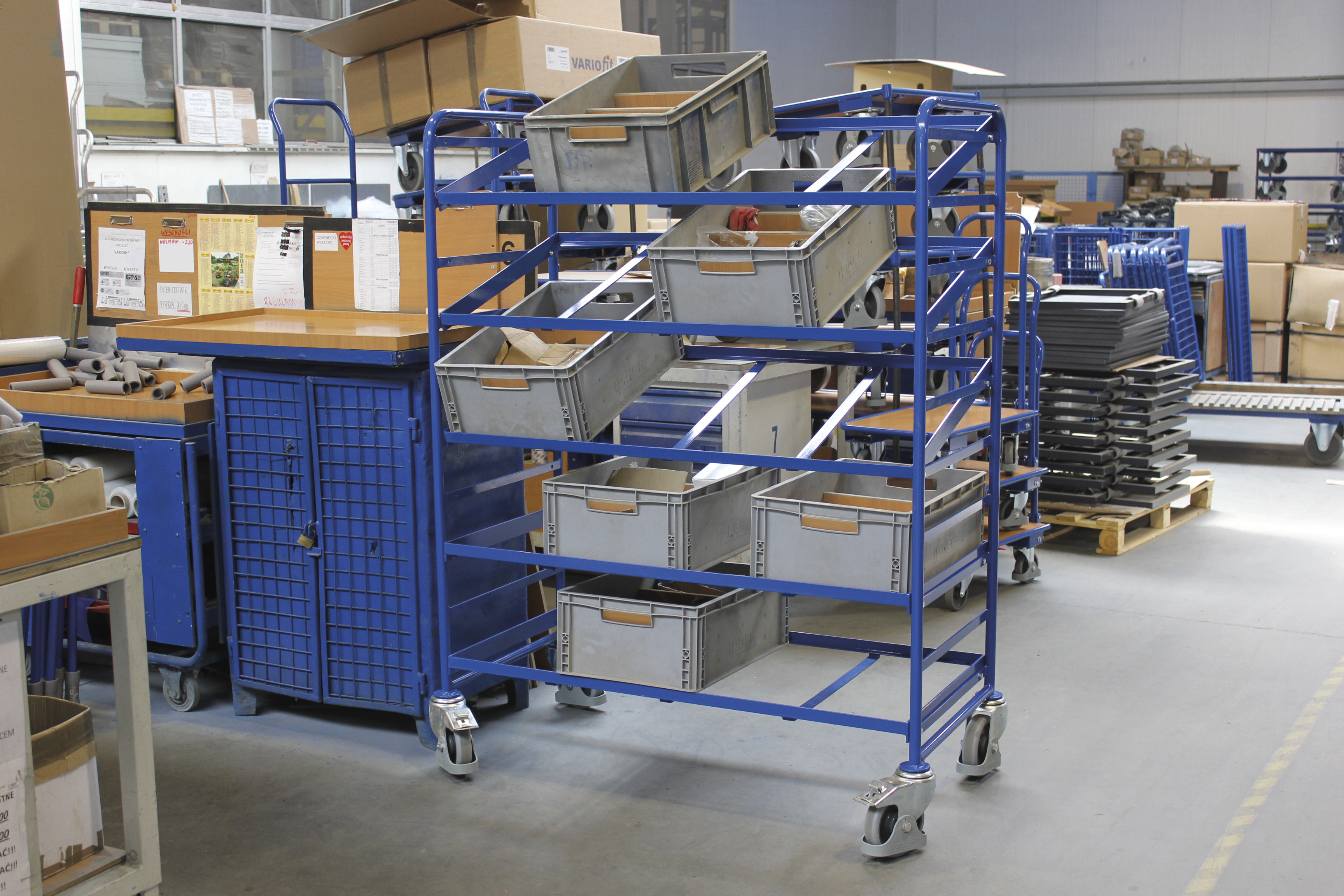 Maximale Ordnung auf kleinstem Raum: Der Eurokastenwagen mit 15 robusten Kunststoffkisten (600 × 400 mm) ermöglicht eine übersichtliche, griffbereite Lagerung. Neigbare Etagen von 17° oder 32° sorgen für ergonomisches Entnehmen, während der 27 mm hohe Rand alles sicher an Ort und Stelle hält. Die oberflächengeschützte Stahlkonstruktion ist schlag- und kratzfest, spurloser Gummi-Laufbelag und 4 Lenkrollen mit Faden- und Fußschutz garantieren leichten, kontrollierten Transport.