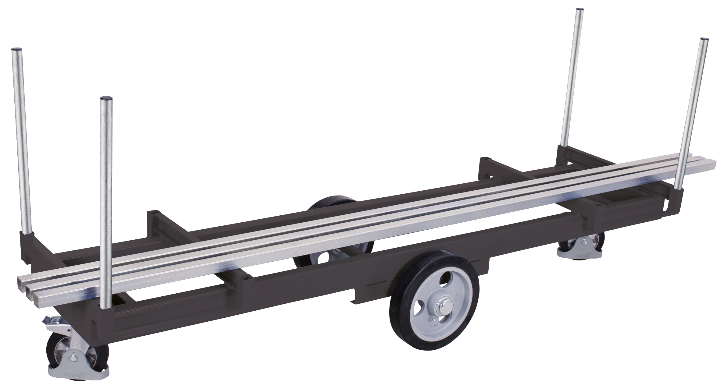 Der Langmaterialwagen mit 4 Rungen kombiniert eine fest verschweißte Stahlkonstruktion mit vier verzinkten Einsteckrungen (Nutzhöhe 610 mm) für sicheren Materialtransport. Die freie Wagenmitte ermöglicht müheloses Beladen per Kran oder Stapler. Eine schlag- und kratzfeste Oberfläche sowie robuster Mittelradsatz mit Lenkrollen und Radfeststeller sorgen für komfortables und sicheres Handling.