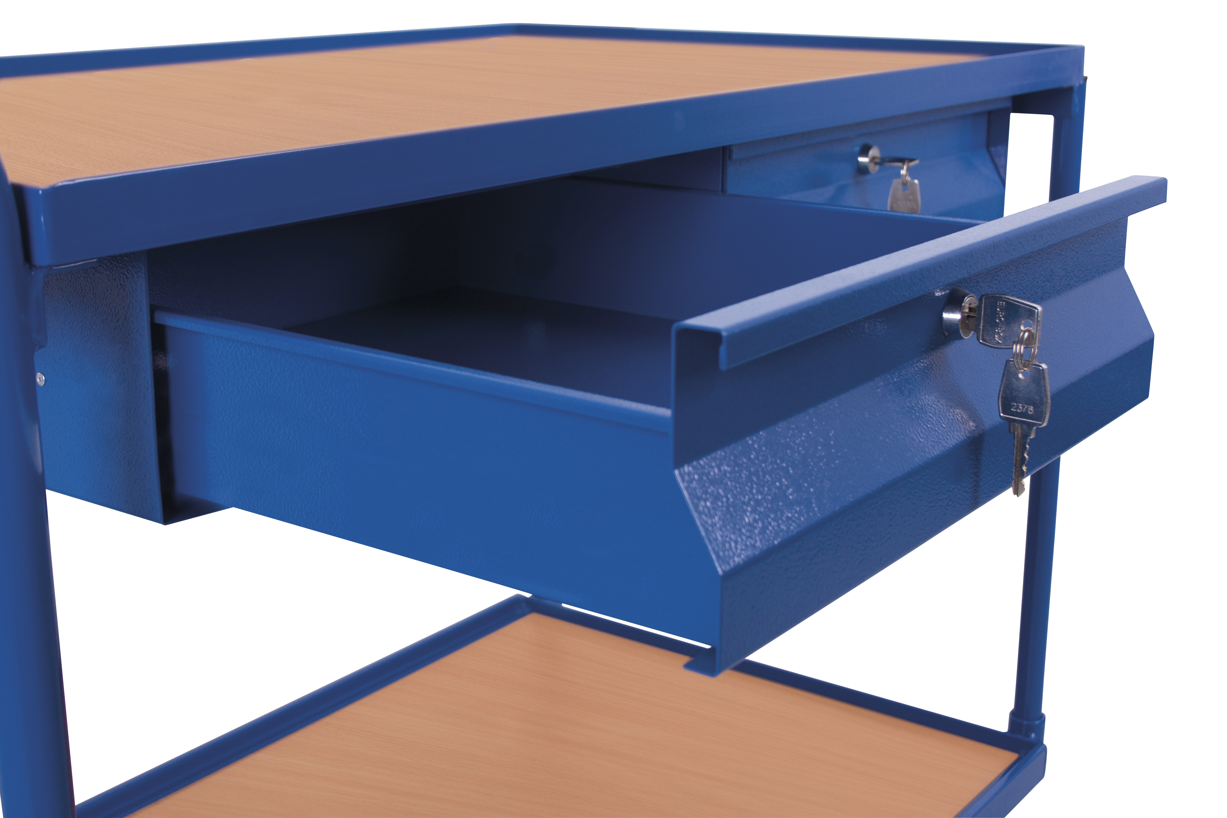 Maximale Ordnung, sicherer Transport: Dieser Tischwagen mit 2 Ladeflächen und 2 Schubladen kombiniert robuste Baukasten-Bodenkonstruktion mit innovativem L-Profil und stabilen Etagen aus Winkelstahl. Die Holzwerkstoff-Ladeflächen mit 15 mm Rand schützen Ihr Transportgut zuverlässig.