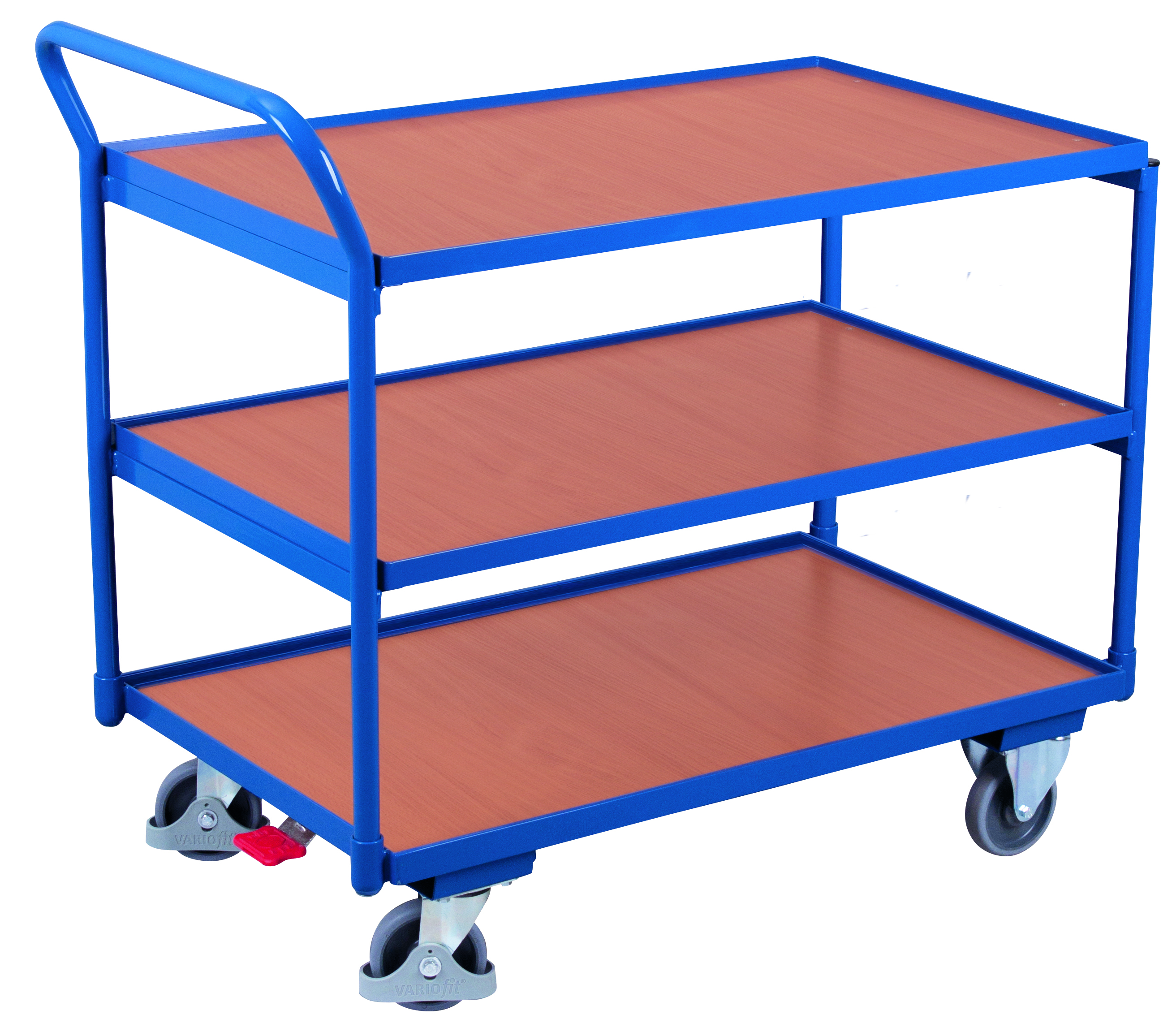Der Tischwagen mit 3 Ladeflächen bietet flexible Organisation in robuster Industriequalität. Das stabile L-Profil-Baukastensystem und die oberflächengeschützten Holzwerkstoffplatten mit 15 mm hohem Rand sichern Ihre Ware zuverlässig. Spurloses Fahren garantieren Rollen aus thermoplastischem Gummi, während das patentierte EasySTOP-Bremssystem maximale Kontrolle und Sicherheit im Lager, in der Werkstatt oder im Versandbereich bietet.