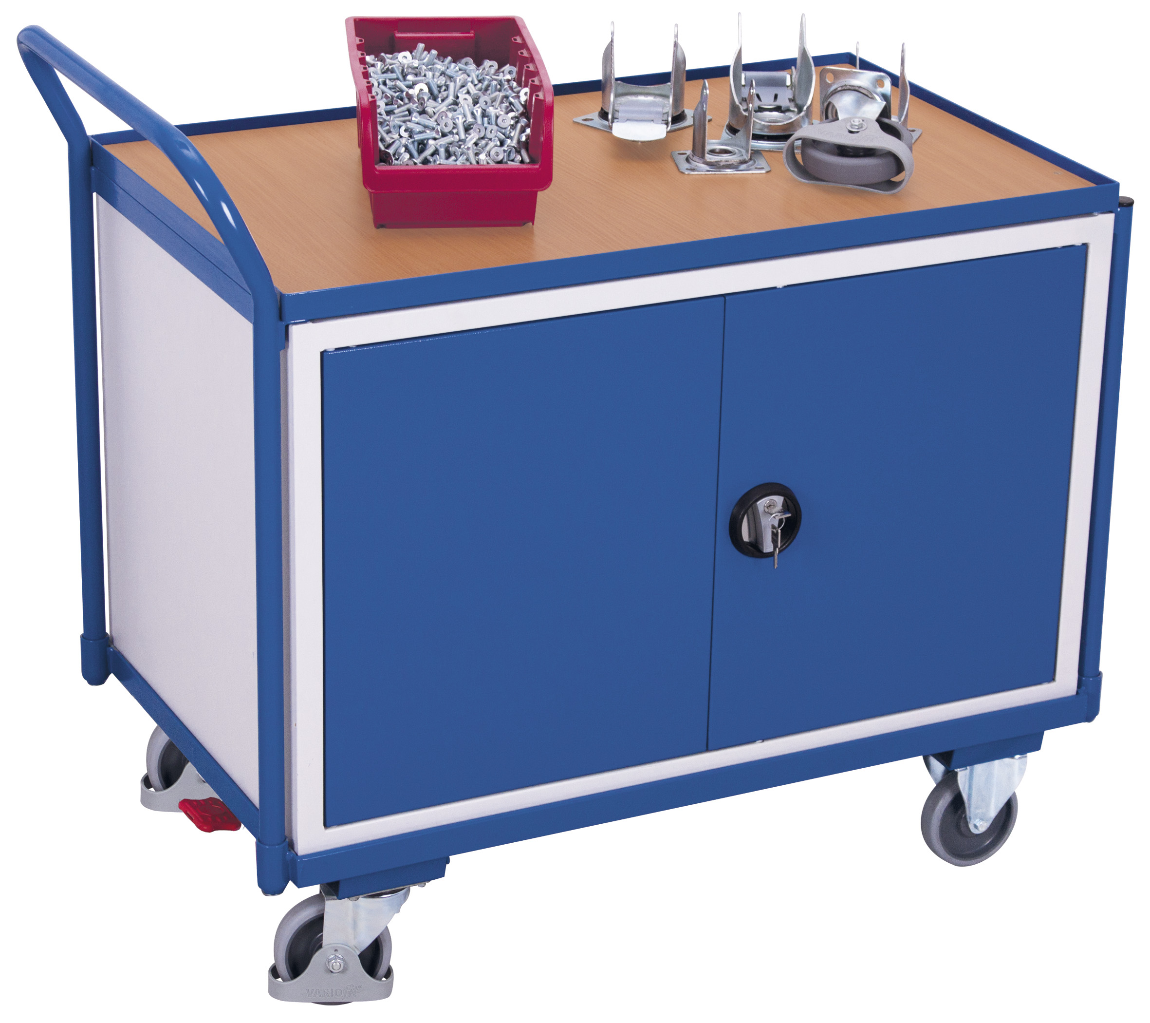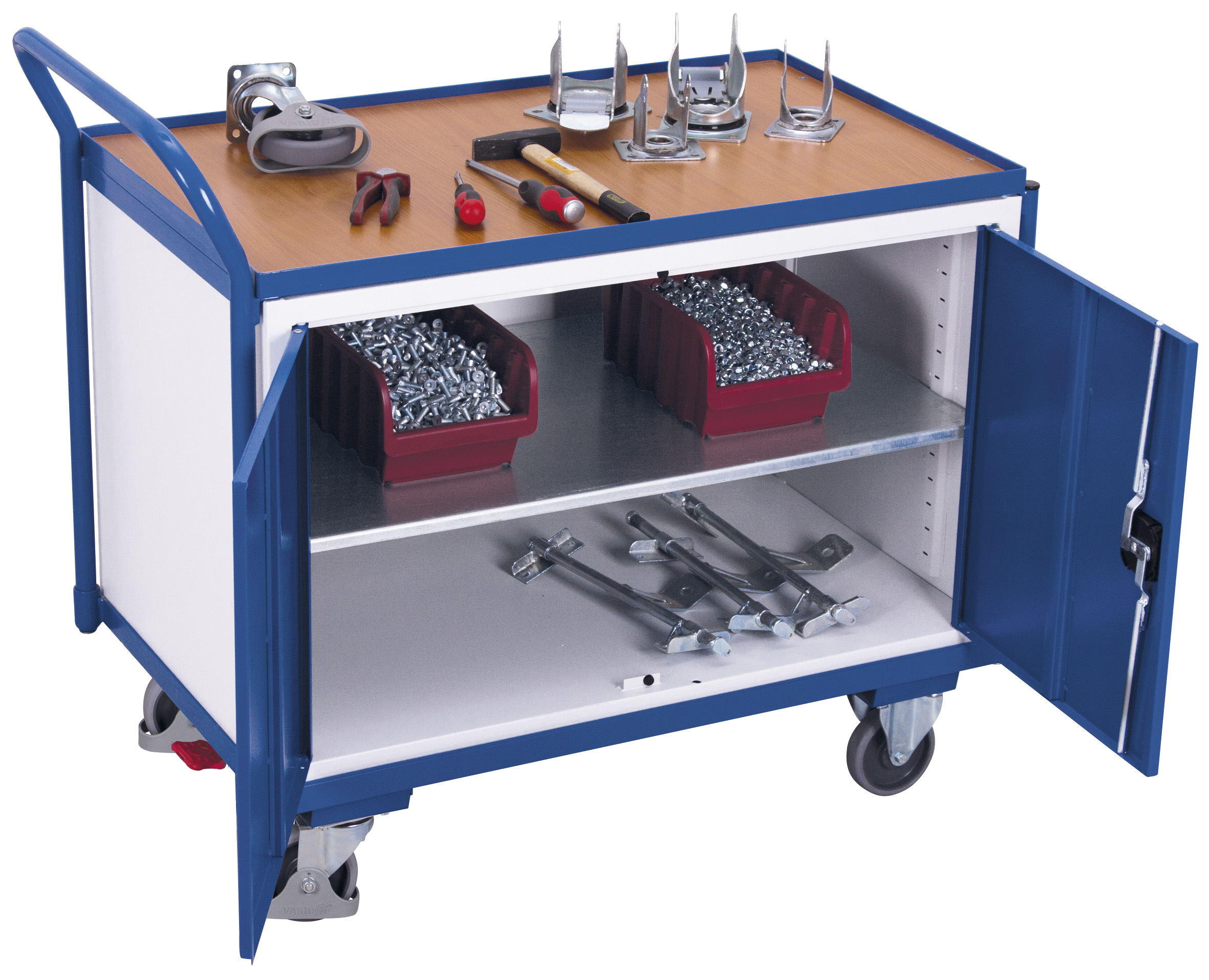 Robust, sicher und mobil: Dieser Werkstattwagen mit 1 Ladefläche kombiniert stabile Stahl-Schweißkonstruktion und L-Profil-Bodenkonstruktion für dauerhafte Belastbarkeit. Die schlag- und kratzfeste Holzwerkstoff-Ladefläche mit 12 mm Rand schützt Ihr Material, während der integrierte Flügeltürschrank mit variablem Boden für Ordnung sorgt. Spurlosen Komfort bieten die TPE-Rollen mit Faden- und Fußschutz sowie das patentierte EasySTOP-Bremssystem für maximal sicheres Abstellen.