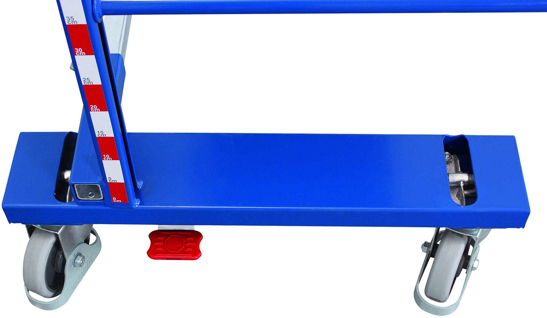 Grey, non-marking thermoplastic rubber tyres with precision deep-groove ball bearings, thread and foot guards ensure smooth, safe manoeuvring. The patented EasySTOP braking system with 2 EasySTOP swivel castors, 2 additional swivel castors (one with direction lock) guarantees secure positioning and controlled steering in demanding warehouse environments.