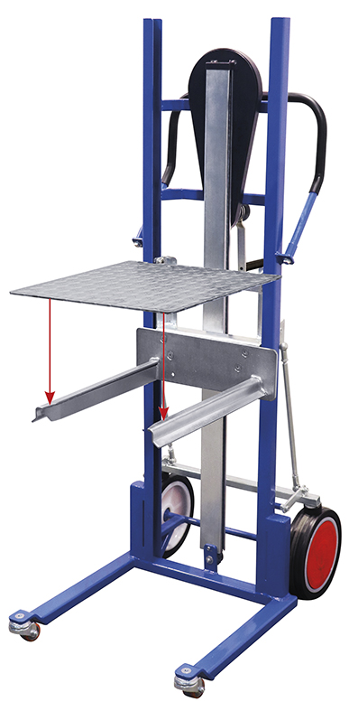 The Material lift incl. fork tines is the reliable partner for precise, everyday handling tasks. Its robust welded steel construction and infinitely adjustable lifting range from 55–1,300 mm via a smooth hand crank ensure accurate positioning at every height. A self-locking winch, ergonomically placed brake lever and large, soft-coated push handle provide safe, comfortable and controlled manoeuvring in demanding environments.