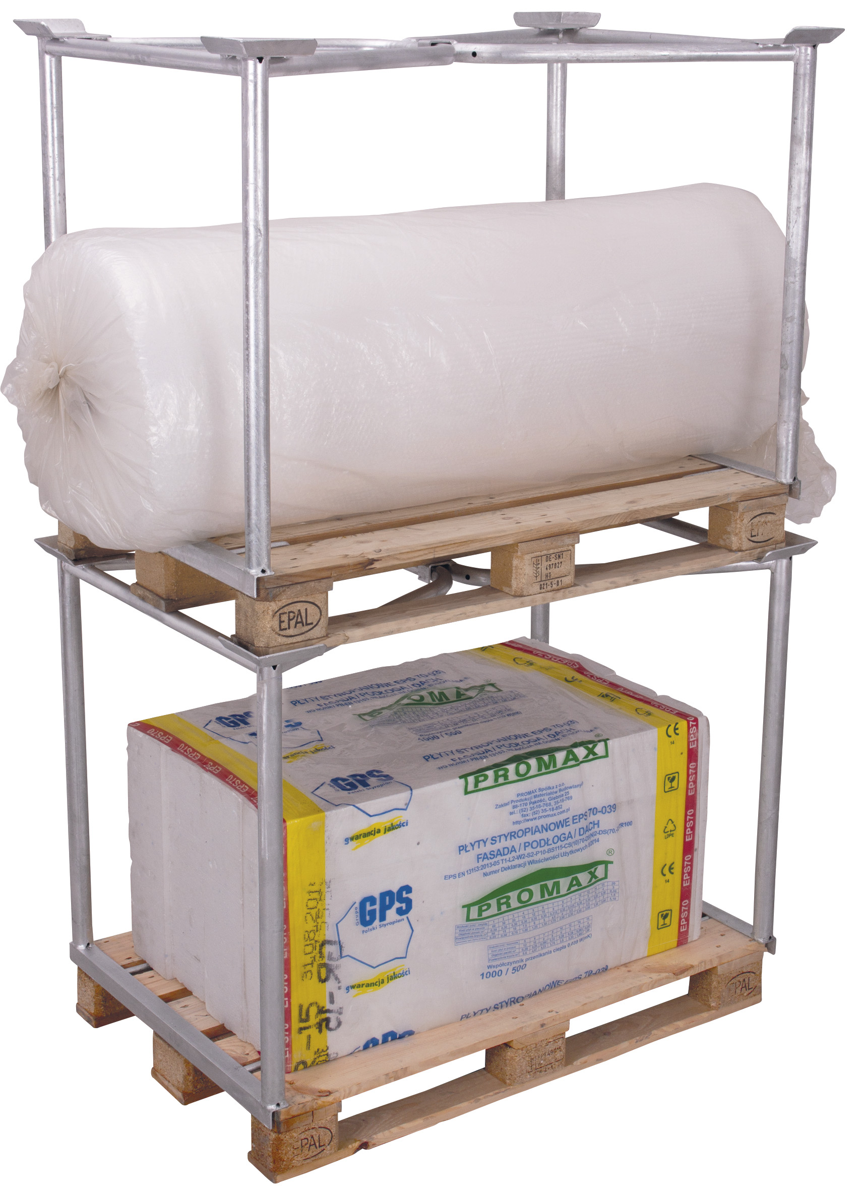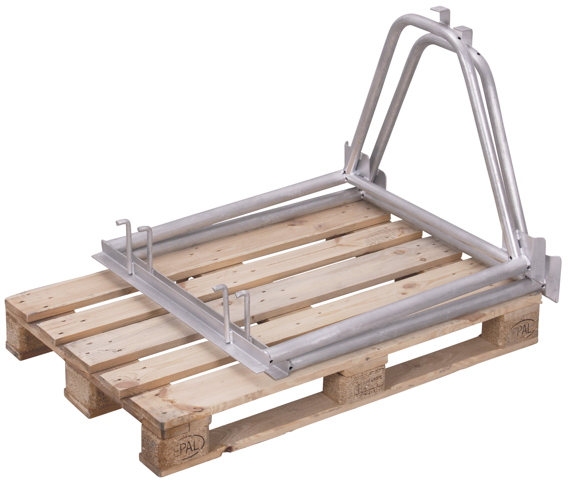 Stackable units remain securely in place and are stabilised by two hooked horizontal frames at the top. The hot‑galvanised finish offers long‑lasting corrosion protection, while the frame can be collapsed or folded to save valuable warehouse space when not in use.