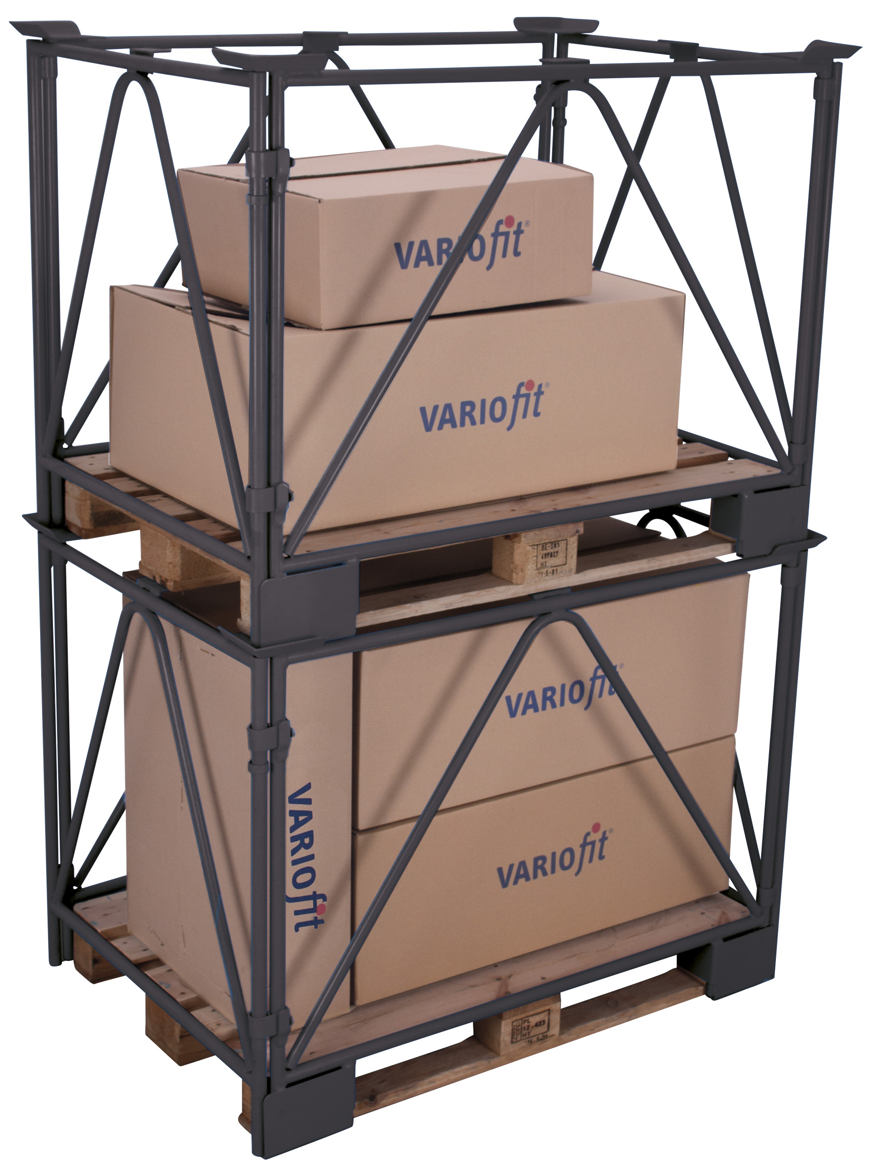 Stackable without shifting and ideal for subsequent fitting to loaded pallets, this frame can be collapsed to save valuable space when not in use.
