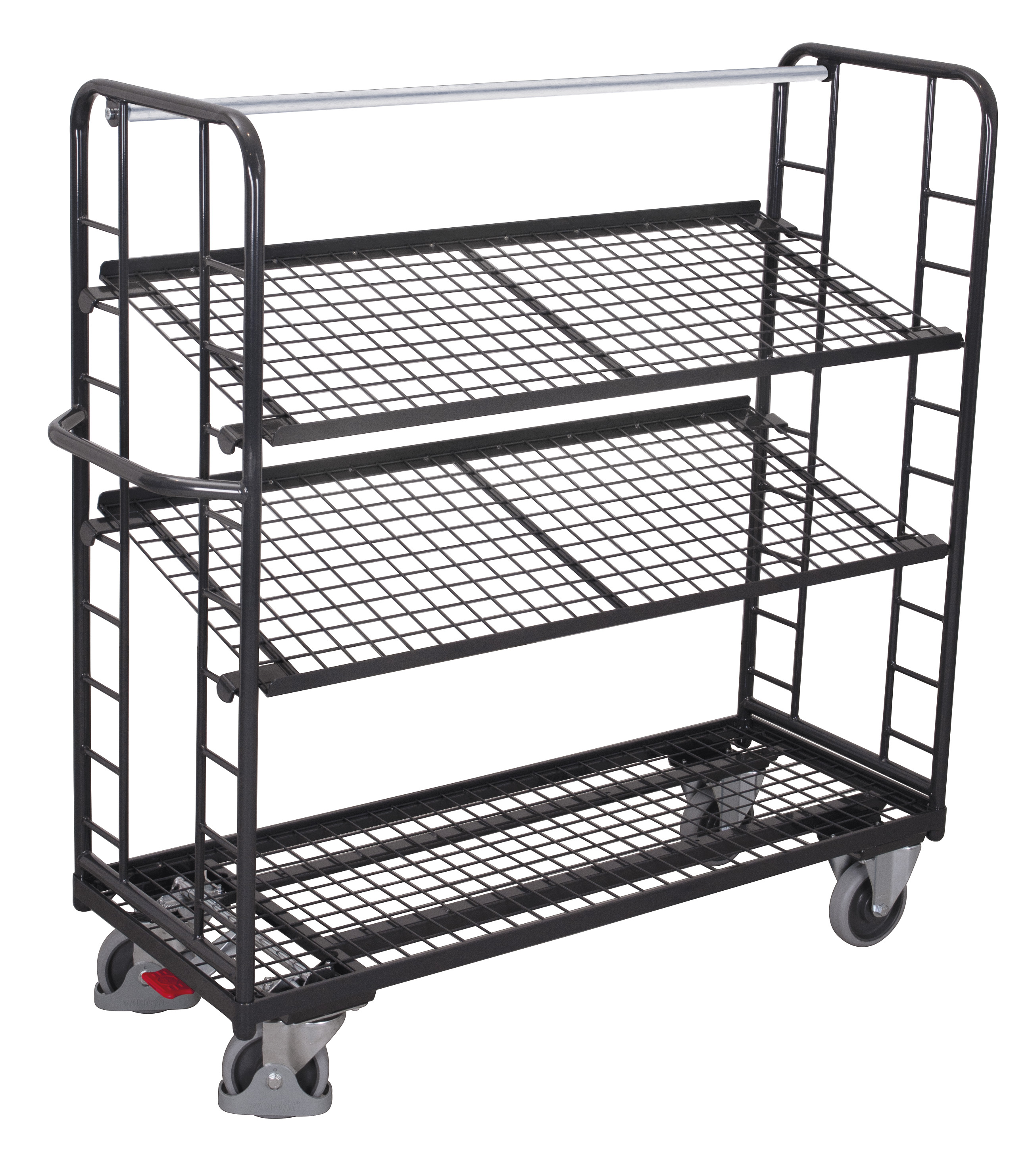 Maximieren Sie Ihre Transporteffizienz mit diesem modularen Etagenwagen mit 3 Drahtgitterböden. Die robuste Basisstruktur mit innovativem Rahmenprofil und variablen Meshböden (50 x 50 mm) erlaubt horizontale oder geneigte Nutzung, dank 120-mm-Raster und 15°-Gefälle.