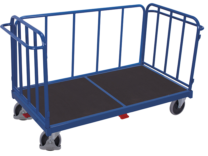 Die 800 mm hohen Seiten- und Stirnwände aus senkrechten Rohren sichern Ihr Ladegut zuverlässig, während eine abnehmbare Seitenwand ein flexibles Be- und Entladen ermöglicht. Laufruhige, graue, nicht kreidende thermoplastische oder elastische Vollgummireifen mit Präzisionskugellagern gewährleisten ein leises und müheloses Handling, geschützt durch Faden- und Fußschutz.
