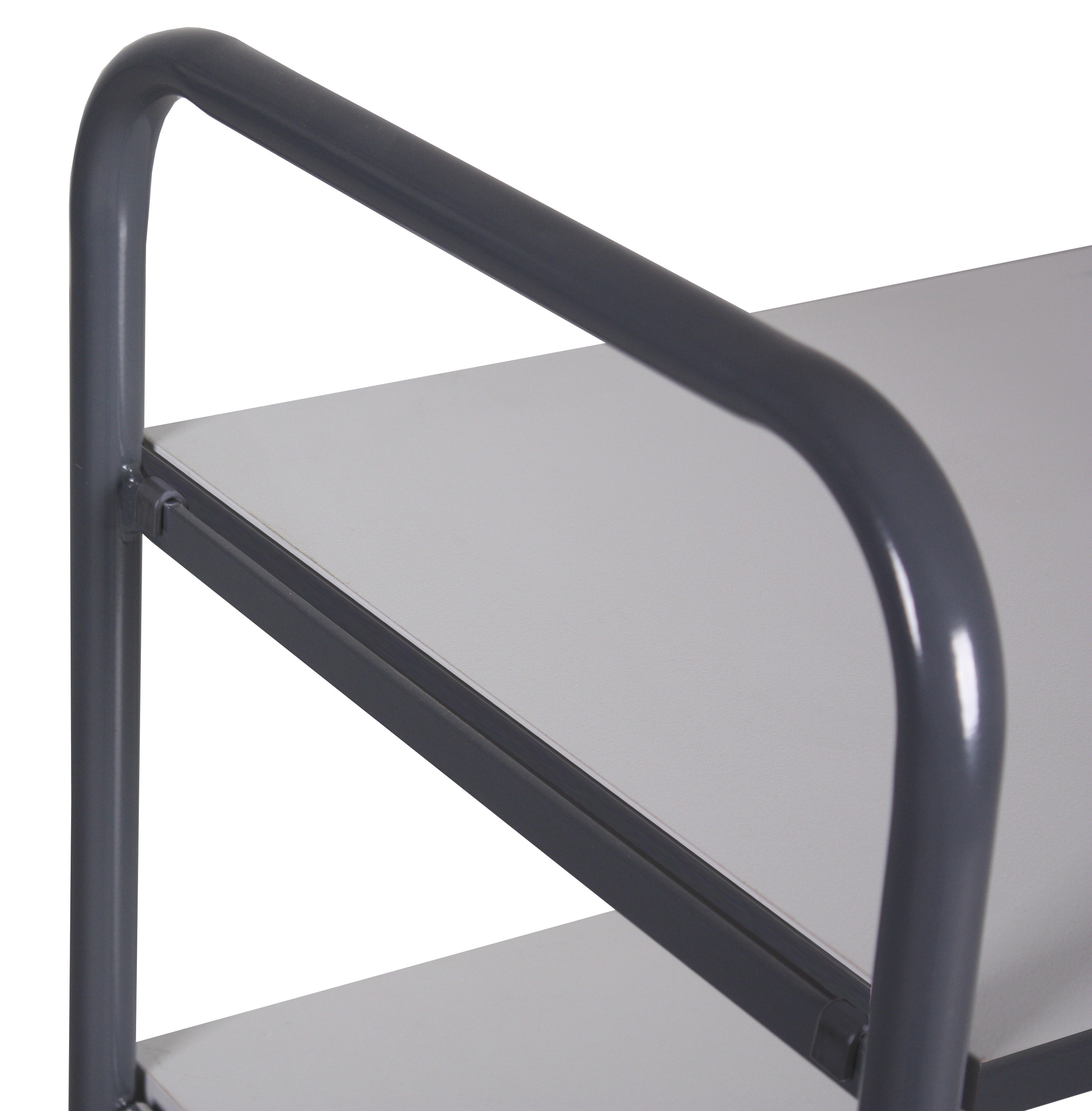 Praktyczne, zawieszane półki można dowolnie konfigurować, stosując zamiennie półki w ramie z kątownika stalowego. Wózek wyróżnia się wysoką odpornością na uszkodzenia mechaniczne, a koła z przewodzącej pełnej gumy termoplastycznej z precyzyjnymi łożyskami kulkowymi gwarantują płynne, ciche prowadzenie.