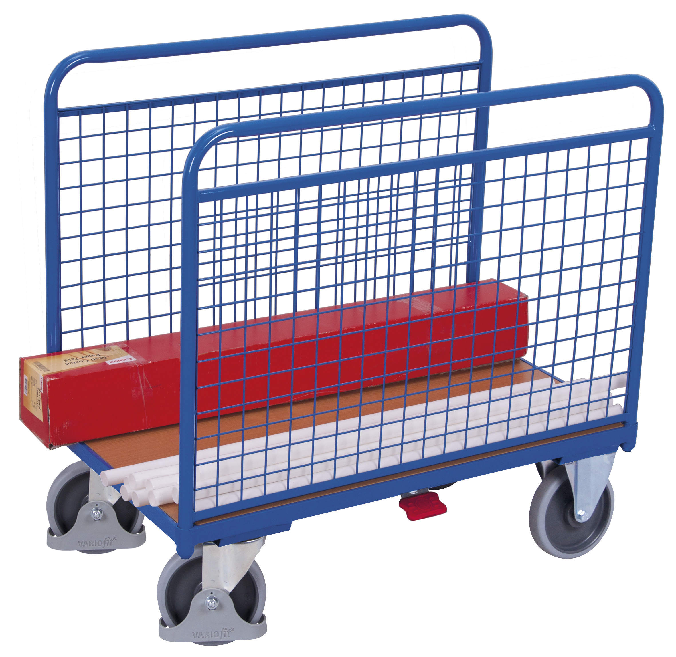 Wózek magazynowy z pałąkami bocznymi wypełnionymi siatką