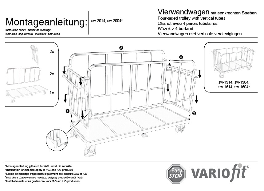 2 koła obrotowe z centralnym hamulcem EasySTOP i 2 koła stałe (EasySTOP na długim i krótkim boku wózka), koła obrotowe z osłoną stopy.