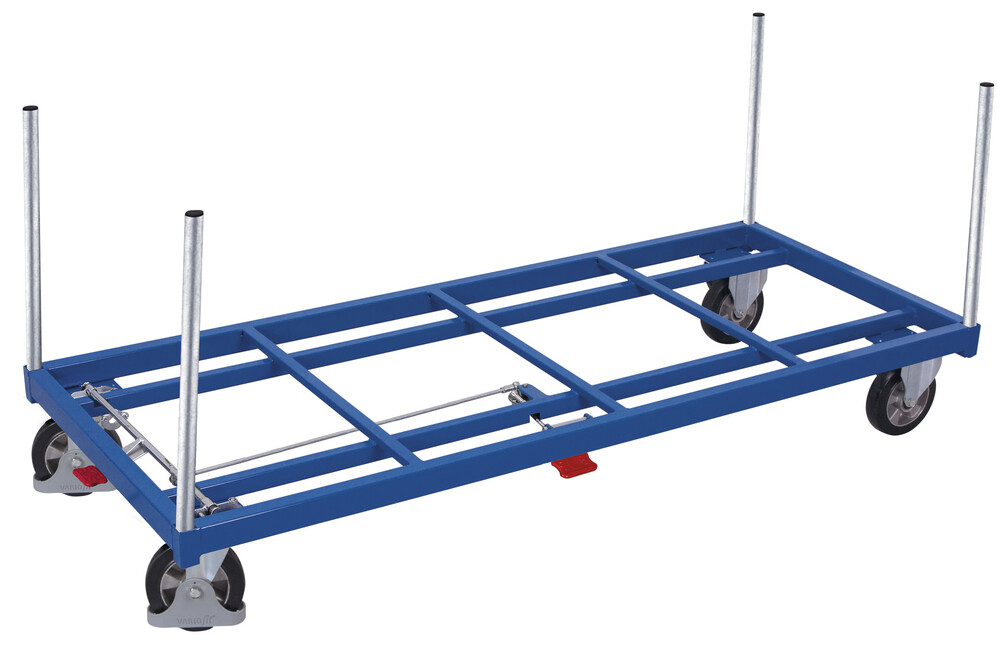 2 koła obrotowe z hamulcem i 2 koła stałe. Przy nośności od 1.200 kg, koła z precyzyjnymi łożyskami kulkowymi, elastyczne z pełnej gumy z felgą aluminiową