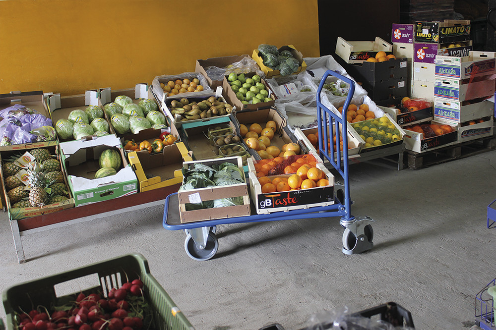 2 Rückenloch-Lenkrollen mit Radfeststeller und 2 Bockrollen.