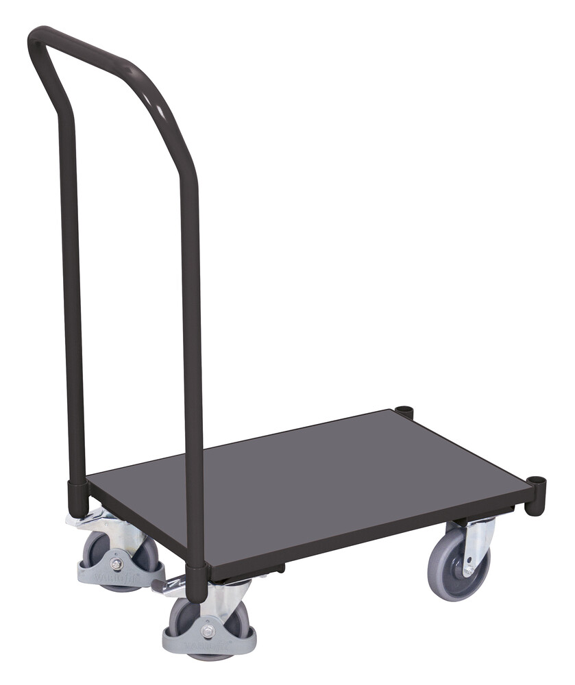 Baukasten-System Bodenkonstruktion aus Rundrohr Ladefläche aus HolzwerkstoffplatteSchiebebügel mit Querstrebe dauerhaft oberflächengeschützt schlag- und kratzfest Bereifung aus thermoplastischem Gummi auf Kunststofffelge mit Präzisions-Rillenkugellager, grau, "spurlos" Faden- und Fußschutz 2 Lenkrollen mit EasySTOP und 2 Bockrollen.