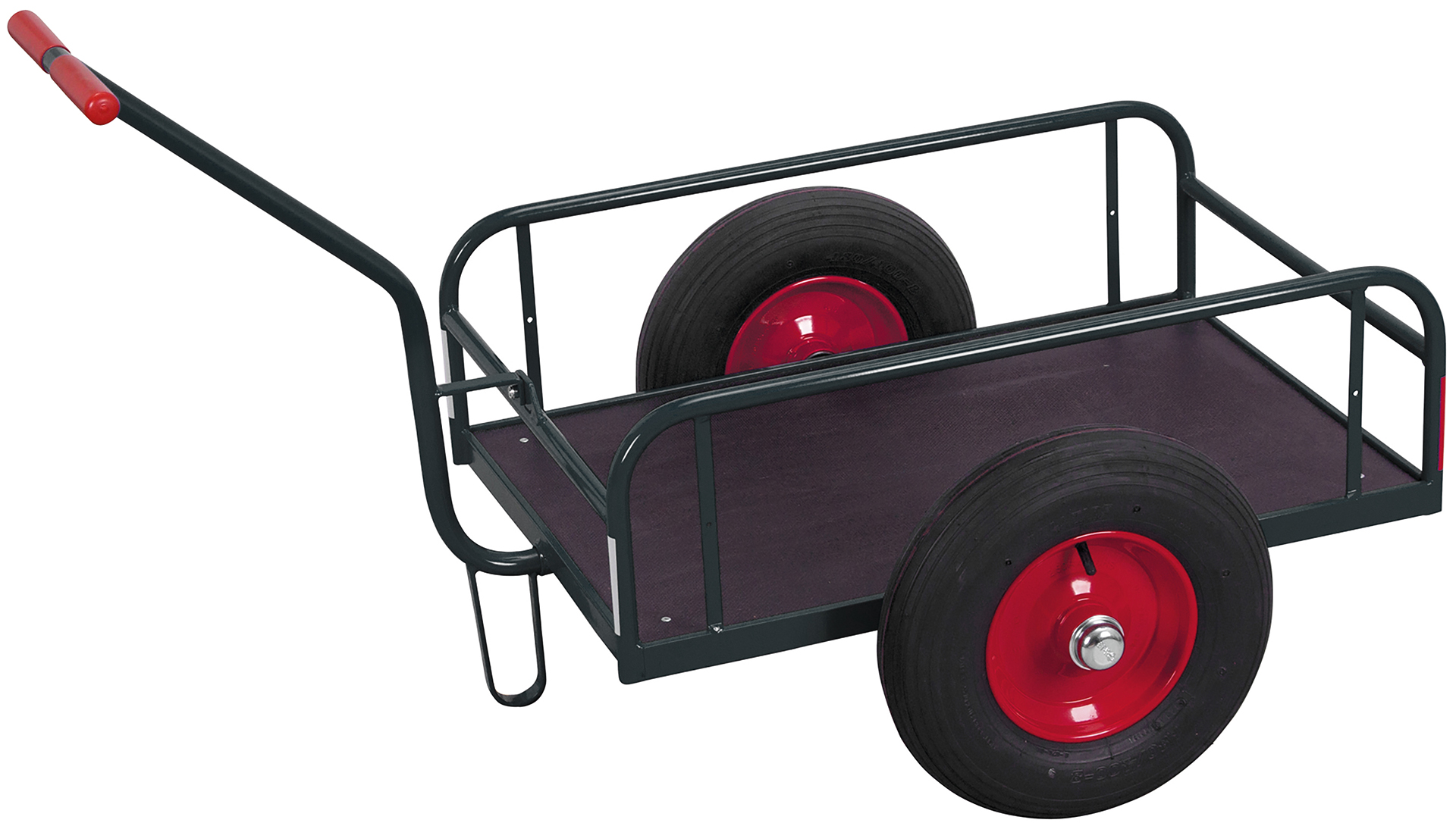 Stabile Schweißkonstruktion aus Stahl Geländer 220 mm hoch mit Sicherheitsreflektoren verschraubte Handdeichsel mit PVC-Handgriffen und Standfuß Ladefläche und Bordwände aus wasserfest verleimtem Sperrholz, Oberfläche Siebdruck, rutschhemmend dauerhaft oberflächengeschützt schlag- und kratzfest Luftbereifung auf Stahlfelge mit Präzisions-Rillenkugellager.