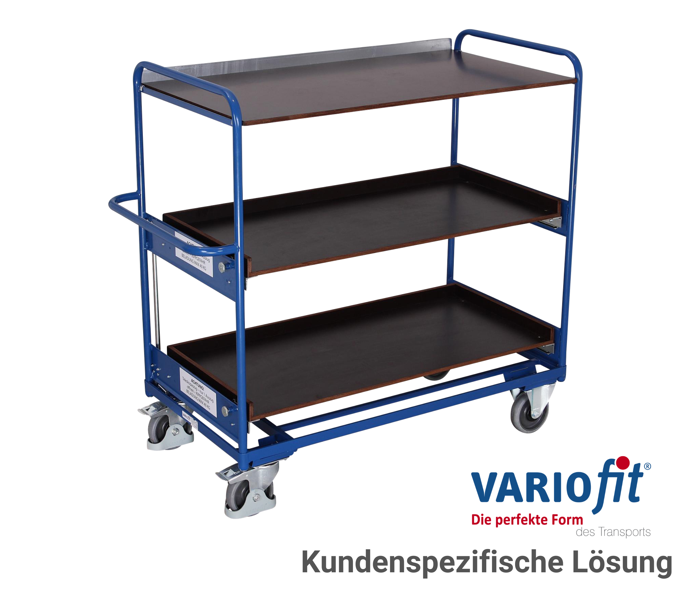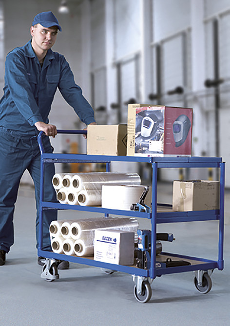 Spawana konstrukcja stalowa półki z płyty drewnopodobnej pasujące do skrzynek z tworzywa sztucznego 600 x 400 mm (szerokość/głębokość) środkowa i górna półka nachylane pod kątem 15° lub 30° nośność górnej i środkowej półki 50 kg wysoka odporność na uszkodzenia mechaniczne bieżnik z szarej gumy termoplastycznej, niebrudzący, na feldze z tworzywa koła z precyzyjnym łożyskiem kulkowym koła z precyzyjnym łożyskiem kulkowym osłona przeciwwłókienna i osłona stopy 2 koła obrotowe z EasySTOP i 2 koła stałe.